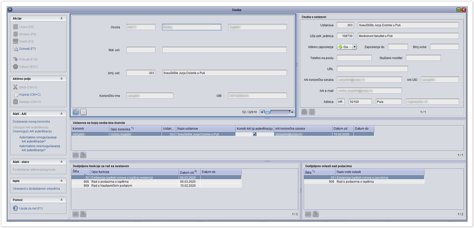 Datum od, datum do - Datum od kad osoba ima ovlasti za rad da ISVU modulima, te datum do kada, ako su ukinute ovlasti. To mogu biti jedino datumi koji su bili u trenutku dodijele odnosno ukidanja ovlasti. Evidencijom datuma do ukidaju se sve dodijeljene funkcije korisnika.