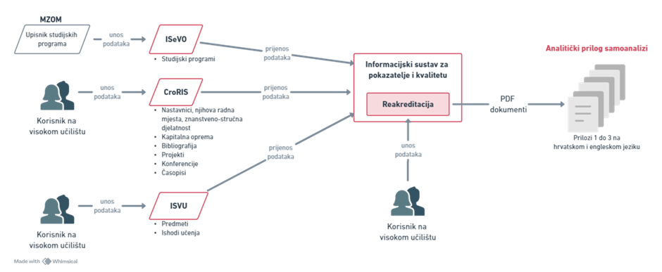 Upravo je u tom dijelu pripreme analitičkog priloga izvješća o samoanalizi, Srce prepoznato kao stručan i pouzdan partner u pružanju podrške visokim učilištima u procesu reakreditacije. Zbog promjena u relevantnom zakonskom okviru (novi Zakon o osiguranju kvalitete je donesen samim krajem 2022. godine), ali i u informacijskom krajobrazu visokog obrazovanja i znanosti postojeći sustav za podršku reakreditaciji visokih učilišta (Mozvag) nije više zadovoljavao potrebe te su zajedničkom analizom postojećih, ali i onih u nastajanju, nacionalnih informacijskih sustava za visoko obrazovanje i znanost, AZVO i Srce osmislili proces pripreme analitičkog priloga koji će visoka učilišta voditi u pripremi priloga i time im uvelike im olakšati taj izazovan proces. Pri tome su prepoznati postojeći informacijski sustavi kao korisni i važni izvori podataka, poput CroRIS-a, ISVU-a, ISeVO-a i Upisnika studijskih programa. Novi informacijski sustav i njegov modul za reakreditaciju (zamjena za Mozvag) će sadržavati podatke potrebne za generiranje analitičkog priloga i biti integriran s postojećim sustavima.