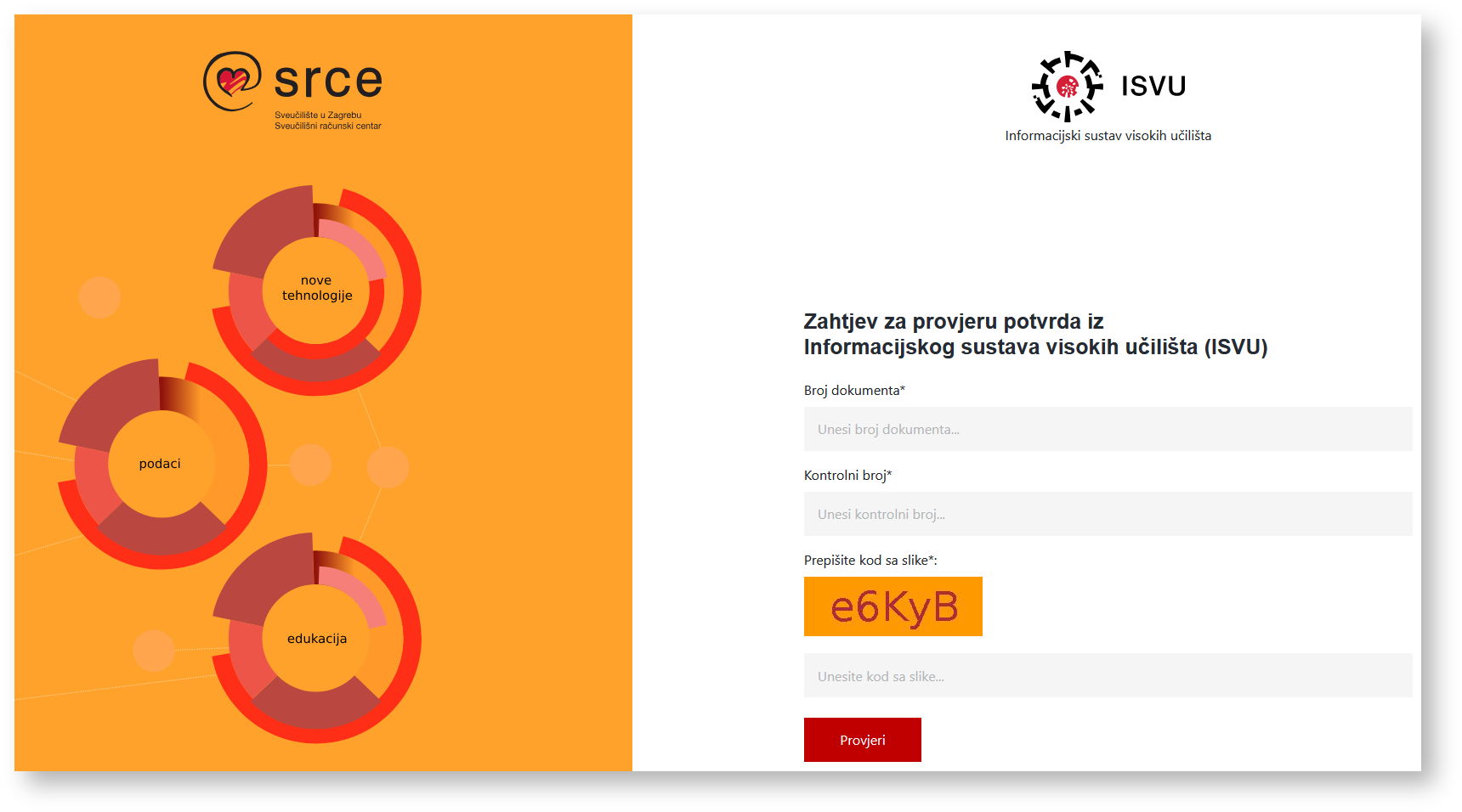 Za provjeru potvrde potrebno je upisati broj dokumenta kao i kontrolni broj (navedeni se brojevi nalaze na potvrdi. Ako potvrda postoji korisnik će dobiti pdf dokument kojeg može usporediti s originalnim dokumentom kojeg provjerava.