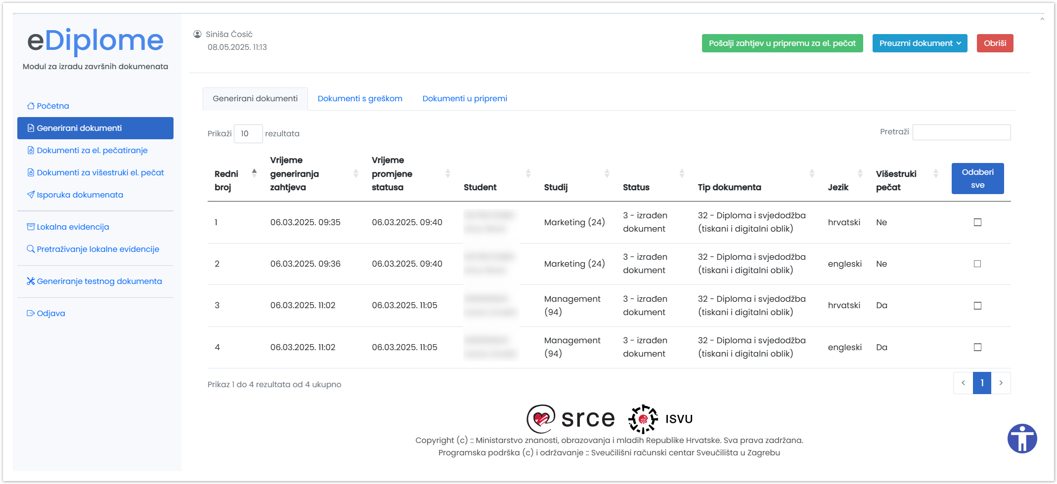 U prozoru Generirani dokumenti prikazuju su dokumenti koji su poslani iz ISVU u Modul za izradu završnih dokumenata (ediplome). Ovaj prozor namijenjen je za provjeru podataka prije koji će biti poslani na ovjeravanje (pečatiranje) elektroničkim pečatom..